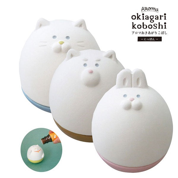 Aromasteen in de vorm van 3 verschillende dieren. Laat je favoriete geurolie druppelen op het witte gedeelte en het gaat lekker ruiken. De aromasteen heeft de vorm van een Okiagari Koboshi en dat is een Japanse traditionele pop!