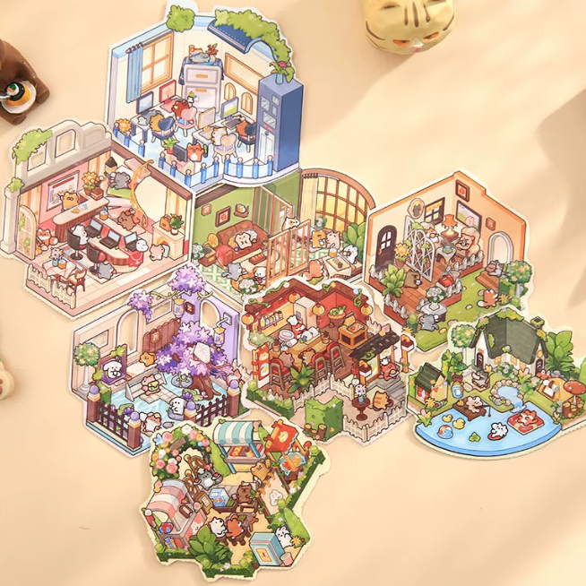 Met deze 3D sticker-set maak je stap voor stap je eigen kamer, winkel of café. Elke set bevat een stevige achtergrondkaart en tientallen stickers met meubels, accessoires en schattige bewoners.