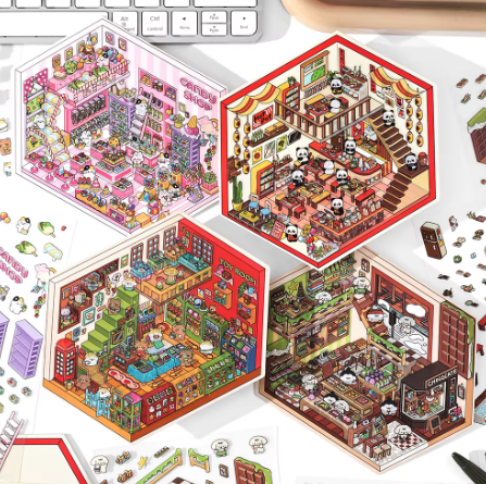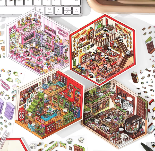 Met deze 3D sticker-set maak je stap voor stap je eigen kamer, winkel of café. Elke set bevat een stevige achtergrondkaart en tientallen stickers met meubels, accessoires en schattige bewoners.
