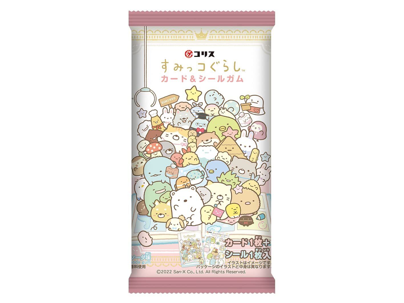 Blind Bag contenant un chewing-gum aromatisé au soda, une feuille d'autocollants et une carte Sumikkogurashi.